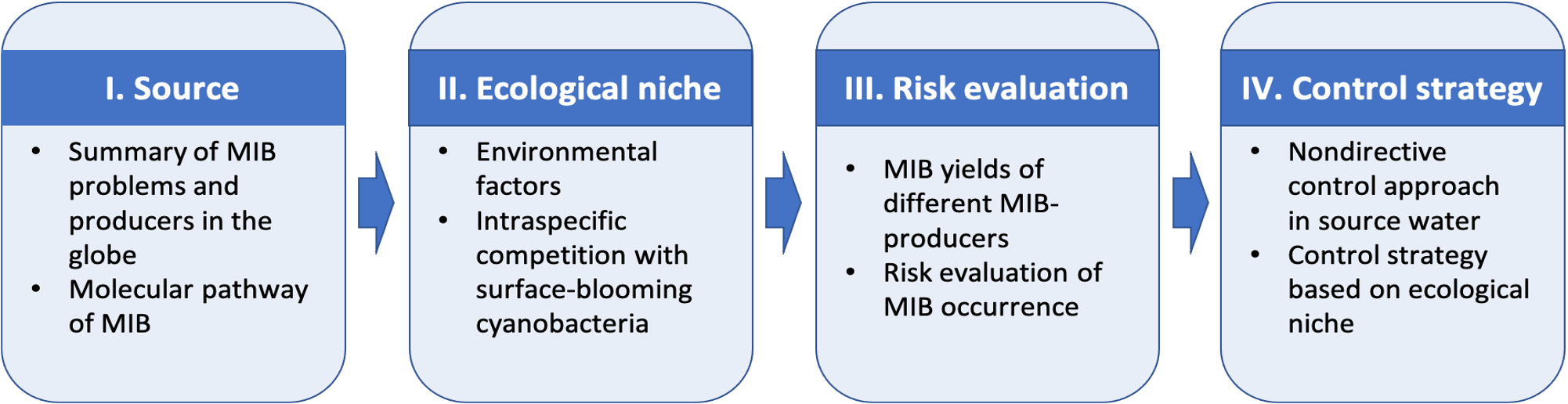 Odor problems in source water caused by 2-methylisoborneol (MIB) have been a common issue in China recently, posing a high risk to drinking water safety. The earthy-musty odorant MIB has an extremely low odor threshold (4–16 ng L-1) and is hard to remove via conventional processes in drinking water plants (DWP), and therefore could easily provoke complaints from consumers. This compound is produced by a group of filamentous cyanobacteria, mainly belonging to Oscillatoriales. Different from the well-studied surface-blooming Microcystis, filamentous cyanobacteria have specific niche characteristics that allow them to stay at a subsurface or deep layer in the water column. The underwater bloom of these MIB producers is therefore passively determined by the underwater light availability, which is governed by the cell density of surface scum. This suggests that drinking water reservoirs with relatively low nutrient contents are not able to support surface blooms, but are a fairly good fit to the specialized ecological niche of filamentous cyanobacteria; this could explain the widespread odor problems in source water. At present, MIB is mainly treated in DWP using advanced treatment processes and/or activated carbon, but these post-treatment methods have high cost, and not able to deal with water containing high MIB concentrations. Thus, in situ control of MIB producers in source water is an effective complement and is desirable. Lowering the underwater light availability is a possible measure to control MIB producers according to their niche characteristics, which can be obtained by either changing the water level or other measures.